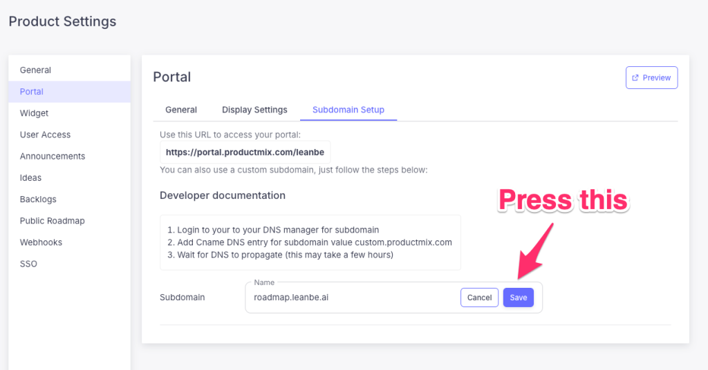 Since we moved from the leanbe.ai domain to productmix.com, if you are making use of the custom subomain option to have your Portal accessible at your own domain (such as roadmap.mywebsite.com), you originally set a DNS entry for roadmap.mywesite.com to point to ProductMix. This value should be updated to point to the new name, ProductMix.