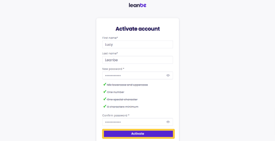 As soon as the user accepts the invitation, they need to insert First and Last names, set the password and press Activate.