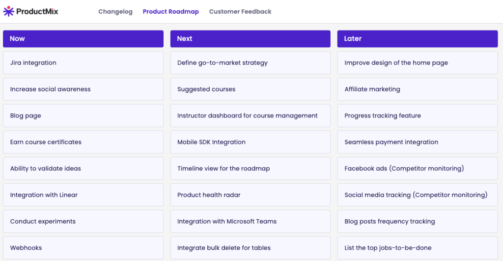By prioritizing features based on customer feedback and strategic goals, you can create a clear, customer-centric roadmap that demonstrates your commitment to user satisfaction. The roadmap can be made public or kept private, depending on your preferences, and can be easily updated as your plans evolve. Learn more about how to manage your product roadmap here: https://help.productmix.com/docs/how-to-manage-the-roadmap-on-ProductMix/